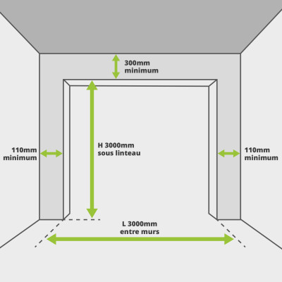 La pose la plus discrète pour une intégration parfaite, la pose se fait uniquement en applique à l'intérieur. La hauteur utile de passage est de 286,8 cm, la largeur utile est de 295cm.