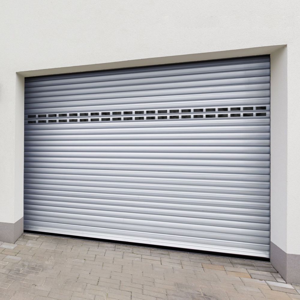 Porte de garage motorisée enroulable avec hublots AMBRE en aluminium - centrale SOMFY - H212 x L240cm