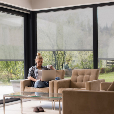 Découvrez le store enrouleur extérieur motorisé avec sa toile en tissu screen, parfait pour l'extérieur. Store avec moteur radio, manœuvre par télécommande.