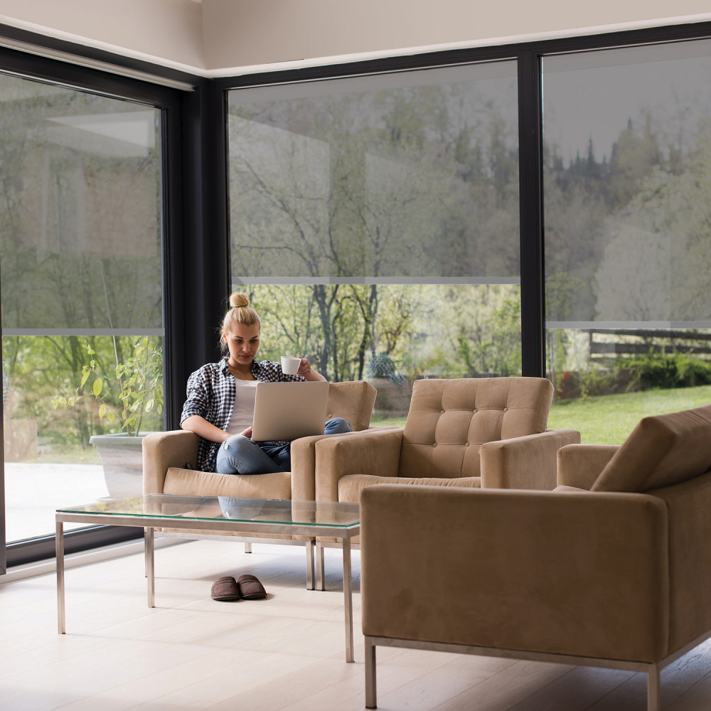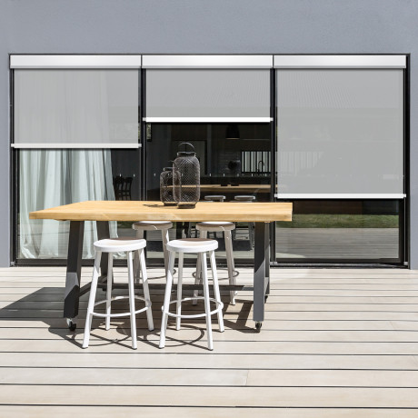 Découvrez le store enrouleur extérieur motorisé avec sa toile en tissu screen, parfait pour l'extérieur. Store avec moteur filaire, manœuvre par inverseur.
